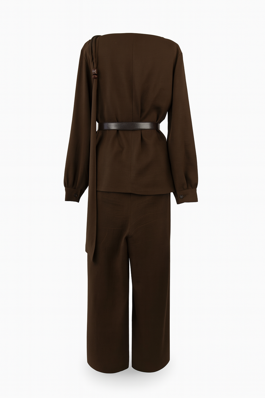 This set is designed to bring comfort and elegance together in one easy outfit. The top features a flowing front flap that drapes across the body like a shawl, anchored neatly with delicate beads to keep it in place. The long sleeves and a matching belt add structure, letting you wear it loose or cinched in at the waist.
